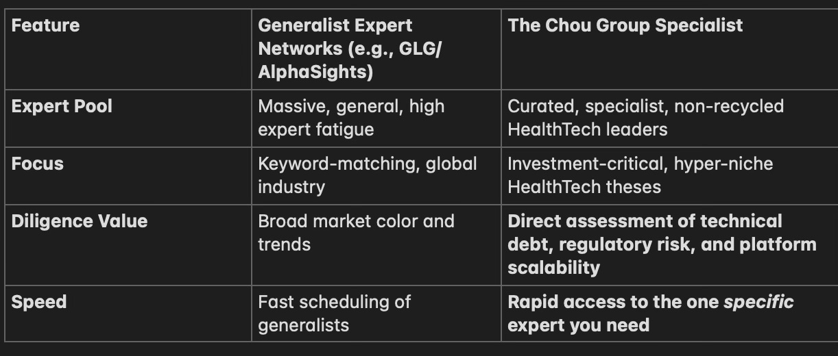 For too long, deal teams have relied on generalist expert networks (ENs) that prioritize speed-to-match over depth of expertise. In a sector as regulated and complex as HealthTech—where compliance with Stark Law, Anti-Kickback Statutes, and technical debt in EHR/RCM platforms can sink a billion-dollar deal—a generalist approach is a critical vulnerability.